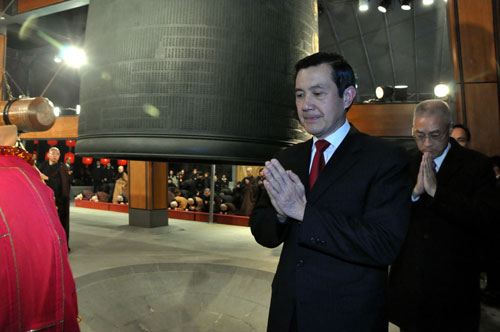 連續(xù)第4年參與撞鐘法會的馬英九、“行政院長”吳敦義、新北市長朱立倫等人,也在果東法師帶領(lǐng)下,合十繞鐘。