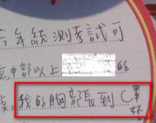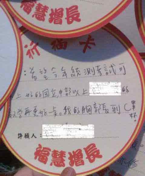 中國(guó)臺(tái)灣網(wǎng)2月9日消息 據(jù)臺(tái)灣“今日新聞網(wǎng)”報(bào)道,臺(tái)灣一名正妹網(wǎng)友nanaling過(guò)年期間到關(guān)帝廟拜拜時(shí),赫然發(fā)現(xiàn)在文昌帝君(民間和道教尊奉的掌管士人功名祿位之神。文昌本星名,亦稱文曲星,古時(shí)認(rèn)為是主持文運(yùn)功名的星宿)面前出現(xiàn)一張讓人捧腹的許愿卡?ㄆ藢(xiě)上希望考試能夠順利的許愿文字,后面竟然還寫(xiě)道愿“我的胸部長(zhǎng)到C罩杯”,讓人不禁哈哈大笑。
