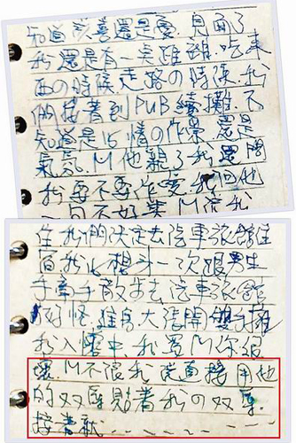 報(bào)道稱,該女子在筆記本中記載了她與美籍華裔男子的性愛(ài)過(guò)程,其中寫(xiě)到:“要不要性愛(ài)”、“內(nèi)心好快樂(lè),好希望時(shí)間停住,也決定去汽車旅館”、“進(jìn)房大張開(kāi)雙手擁我入懷,我罵M你很壞,M不讓我說(shuō),直接用他的雙唇貼著我的雙唇,接著就……”等露骨語(yǔ)句;且她還被丈夫查到寄內(nèi)衣褲給情夫的郵遞收據(jù),另外一名香港男子也坦承和沈女發(fā)生過(guò)性關(guān)系。