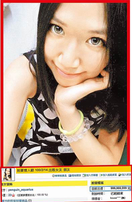 賬號“水瓶座企鵝”的網友在拍賣網站上張貼了一張大眼美女照,拍賣“出租女友”,最后以近10億元天價結標(藍框處)。 來源:臺灣媒體