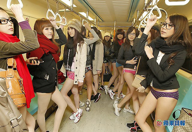昨日為Reebok倡導(dǎo)的“無褲日”,20名正妹只穿內(nèi)褲搭乘捷運(yùn),引起了男乘客的騷動(dòng)。圖片來源:臺灣媒體