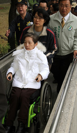 因龍?zhí)栋副慌行痰膮鞘缯,上午到高雄地檢署報到,準備轉(zhuǎn)往臺中培德醫(yī)院評估是否服刑,吳淑珍由看護推入高雄地檢署,兒子陳致中緊跟在后。圖片來源:臺灣《聯(lián)合報》