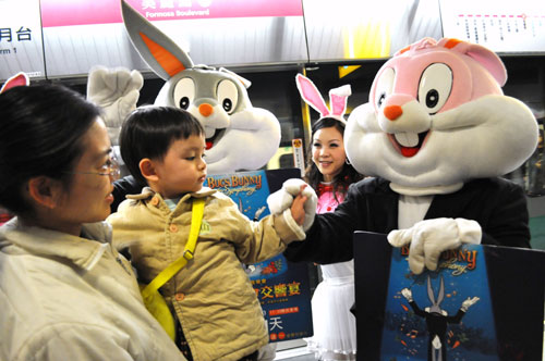 2011高雄春天藝術節(jié)“兔寶寶大鬧交響宴”草地音樂會26日將登場,經典卡通人物兔寶寶22日搭高雄捷運為演出造勢,受到小朋友歡迎。 圖片來源:“中央社”