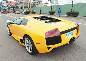 蘭博基尼跑車上路用的是試車牌,而車子前面因車牌架還未購入,未掛上車牌。