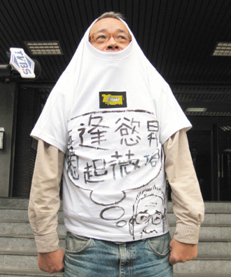 臺灣《壹周刊》專欄作者馮光遠,出庭前扮成保險套。圖片來源:臺灣《聯(lián)合報》