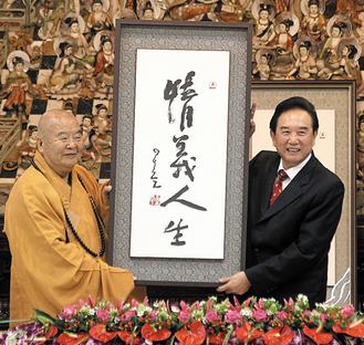 大陸海協(xié)會(huì)長(zhǎng)陳云林(右),昨天到高雄佛光山參訪,星云法師(左)贈(zèng)送墨寶“情義人生”給他。