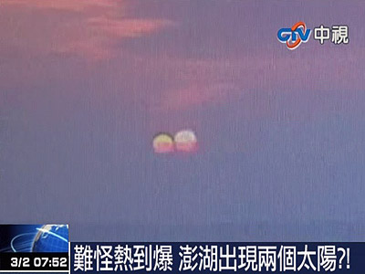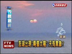 據(jù)報(bào)道,臺(tái)灣網(wǎng)絡(luò)近日瘋傳一組澎湖“兩個(gè)太陽(yáng)”的奇異照片。照片當(dāng)中,好像真的出現(xiàn)兩個(gè)太陽(yáng),相偎相依,網(wǎng)友稱之為奇特的“太陽(yáng)雙胞胎”景象。有網(wǎng)友表示,“莫非太陽(yáng)也有分身術(shù),難道天真有異象嗎?”