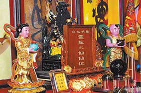 靈狐大仙仙位左有桃花仙子,右有招財(cái)童子,據(jù)稱拜了可以旺人緣、桃花。圖片來源:臺(tái)灣媒體