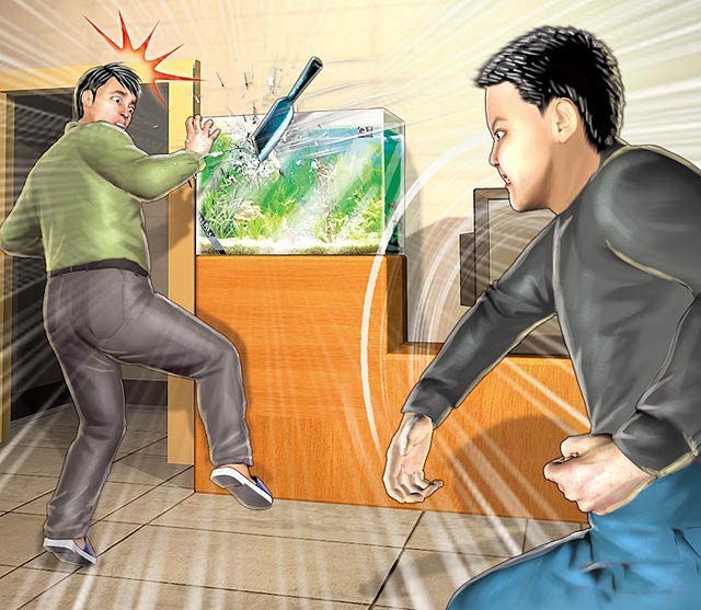 林姓少年因養(yǎng)父拒絕幫他養(yǎng)小孩,竟從背后射飛刀暗算養(yǎng)父,幸射破水族箱未傷及養(yǎng)父。圖片來源:臺灣媒體