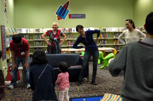 周美青15日上午到奧克蘭市立圖書館為孩童說故事,在說故事前,館員先暖身帶動唱,周美青也跟著小朋友手舞足蹈。圖片來源:“中央社”