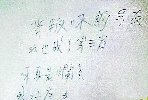 中國臺灣網(wǎng)3月22日消息 新北市一名男子和前女友分手后,要到對方租屋處整理私人物品,但前女友始終避不見面,男子一怒之下,昨天凌晨竟?jié)撊雽Ψ阶馕萏幠米哂嬎銠C,并在屋內墻上以簽字筆留言:“你真是爛貨,我好慶幸,我的東西全還給我!苯Y果前女友剛好返家,雙方一陣拉扯引來路人報案,男子因此被逮捕。