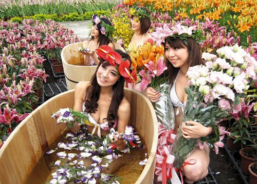 30日的活動在中社花市舉辦,4名模特兒身材火辣,穿戴上后里主要銷日花卉,包括百合、洋桔梗、文心蘭、火鶴,再以薰衣草等香草當(dāng)泡澡主材,百合等花卉的花瓣放進(jìn)泡浴桶,模特兒清涼入浴,在一片花海的花花世界中,更顯繽紛,活動主持人不禁喊出“真是色香味俱全”。