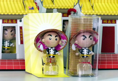 臺灣屏東六堆忠義祠推出客家公仔,主角是六堆客家烈士忠勇公,公仔頭戴斗笠、手持竹竿綁菜刀。忠義祠還準備推出電音忠勇公,趕上時代潮流,成為臺“客”文化。圖片來源:“中央社”