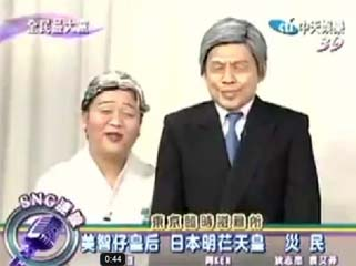 據(jù)報(bào)道,當(dāng)日節(jié)目是模仿明仁天皇夫婦至東京武道館時(shí),屈膝跪在榻榻米上向?yàn)?zāi)民慰問的景況,由阿KEN、納豆分別飾演“明芢天皇”及“美智仔皇后”;他們?cè)诤?jiǎn)單的問候之后,即開始演出下跪戲碼,阿KEN還搞笑地在半蹲后迅速“彈起”,展現(xiàn)“明芢天皇”的矯健身手。