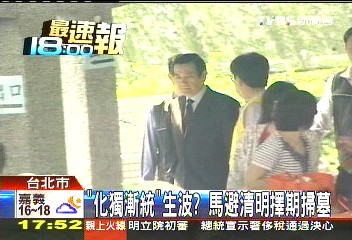 今年清明節(jié),馬英九沒有選擇這天給父親馬鶴凌上香,其父安葬的富德公墓只見馬英九母親秦厚修出現(xiàn)。由于日前民進黨主席蔡英文,重提馬鶴凌的骨灰壇刻著“化獨漸統(tǒng)”,使得馬英九父親的政治認同又受到矚目,不過臺灣“總統(tǒng)府”對此解釋稱,“馬英九只是不想擾民,會另外擇日掃墓”。