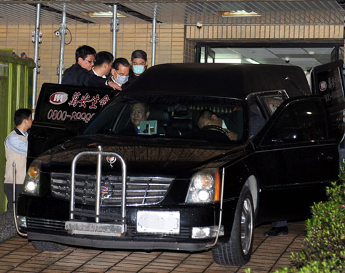國(guó)民黨榮譽(yù)主席連戰(zhàn)(后右 2)的母親趙蘭坤17日病逝臺(tái)大醫(yī)院,晚間連戰(zhàn)將母親送上車(chē)后,與兒子連勝文(后右)一同入車(chē)離開(kāi)醫(yī)院。圖片來(lái)源:“中央社”