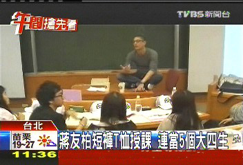 中國臺灣網(wǎng)4月25日消息 據(jù)臺灣TVBS電視臺報道,今年剛剛進入臺灣亞洲大學(xué)教書的蔣友柏,已經(jīng)開除5個學(xué)生,日前還把學(xué)生們帶到自己的公司上課,穿短褲、T恤,還抽煙飆臟話,小腿上看來像刺青的圖案也很吸睛。不過學(xué)生們大都認為,蔣友柏老師直接告知社會現(xiàn)實面,讓大家收獲很多。蔣友柏也稱這就是他最想教給學(xué)生的東西。