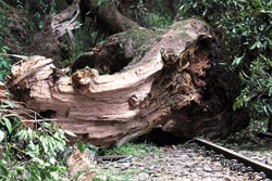 砸中列車、倒伏在鐵軌旁的森氏櫟支干,下半部木質(zhì)顏色正常、上半部卻可見(jiàn)黑壓壓一片的腐朽痕跡。片來(lái)源:臺(tái)灣《中國(guó)時(shí)報(bào)》