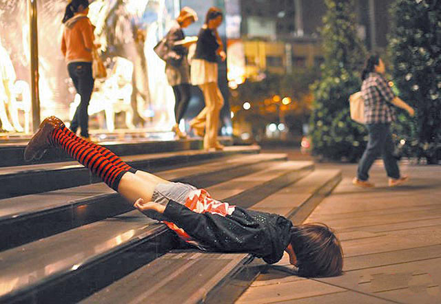 仆街少女Karren在臺中的勤美誠品前仆街時,還引起路人竊笑。圖片來源:臺灣媒體