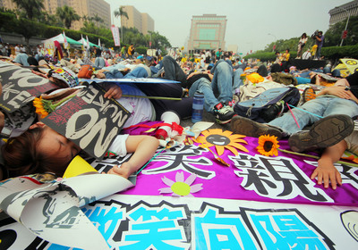 游行民眾在行進(jìn)途中上演行動(dòng)劇:核災(zāi)警報(bào)響起后,數(shù)千民眾集體倒下,無(wú)聲靜默約5分鐘,模仿核災(zāi)發(fā)生的死傷狀況。來(lái)源:臺(tái)灣“今日新聞網(wǎng)”