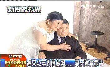 據(jù)臺(tái)灣TVBS電視臺(tái)報(bào)道,臺(tái)中一位黃太太在結(jié)婚42年后,總算如愿披上白紗,她16歲那年,不顧家人反對(duì)嫁給先生,沒公開宴客,也沒拍婚紗,8年前,先生罹患小腦萎縮癥,病情逐漸惡化,于是,3位兒女決定在母親節(jié)前夕,安排爸爸套上西裝、媽媽披上白紗,彌補(bǔ)當(dāng)年沒能拍婚紗照的遺憾。兩人堅(jiān)貞愛情令人動(dòng)容。