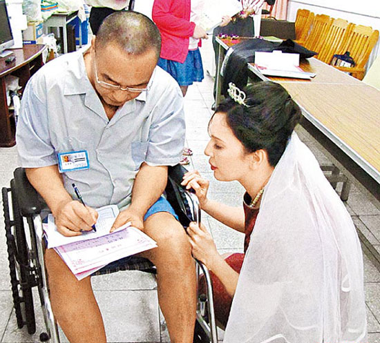 據(jù)臺灣媒體報道,臺灣黑幫竹聯(lián)幫捍衛(wèi)隊長孟憲祥與前妻陳微妮,昨天在臺中監(jiān)獄第二度結婚,戶政人員到場幫兩人辦理結婚登記。孟憲祥因中風右手無力,勉強為新娘掀婚紗、戴婚戒,表情有些別扭,完婚回后臺才對陳微妮說:“原來我的腰圍不是48吋,只有36吋。”她才恍然大悟:“難怪你走得怪,原來怕褲子掉下來!