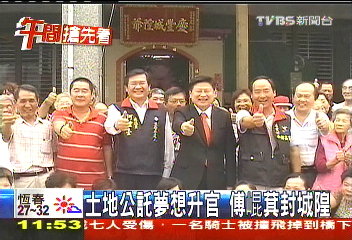 中國(guó)臺(tái)灣網(wǎng)5月7日消息 據(jù)臺(tái)灣TVBS電視臺(tái)報(bào)道,臺(tái)灣花蓮縣吉安鄉(xiāng)有尊土地公,向信徒托夢(mèng)想升官變城隍爺,花蓮縣長(zhǎng)傅崐萁應(yīng)鄉(xiāng)親要求幫土地公升官,也擲筊(占卜用具)獲得神明同意。報(bào)道稱,只不過(guò)以前是天子封神,傅崐萁為地方父母官,幫土地公升官,情況少見。