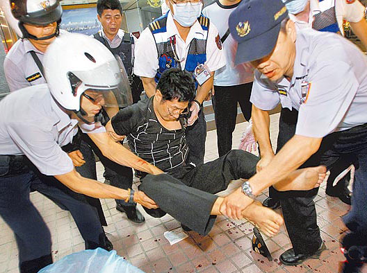男子黃耀生在警察局門口持美工刀割手臂自殘,眾人合力將他制伏送醫(yī)。圖片來(lái)源:臺(tái)灣媒體
