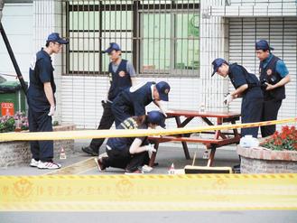 臺(tái)灣苗栗仁德醫(yī)專校園驚傳學(xué)生遭槍擊,4名歹徒在宿舍大樓旁的休閑桌椅處,用手槍敲擊兩名學(xué)生頭部,流彈并傷及另一名學(xué)生手指,警方在現(xiàn)場(chǎng)搜證。圖片來源:臺(tái)灣《聯(lián)合報(bào)》