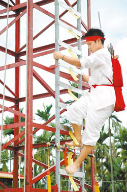 攀爬鋒利的刀梯,李政賢神情專注,一步步都踏得小心翼翼。圖片來源:臺灣《中國時報》