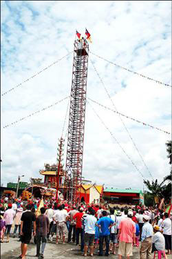 屏東縣竹田鄉(xiāng)五王宮與興義堂昨天舉辦神升晉職儀式,11位神明駕前護衛(wèi)、乩童及先鋒官,奉旨攀登72層刀、釘梯。圖片來源:臺灣媒體