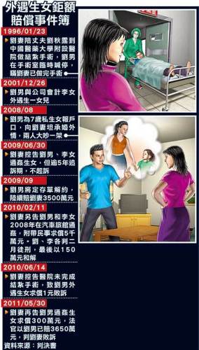 劉妻怒告兩人通奸,但因過了追訴期,獲檢方不起訴,隨后改針對通奸生女部分提告索賠300萬元(新臺幣,下同)。劉男向臺中地方法院法官表示,前年9月起傾畢生積蓄,陸續(xù)給妻子3500萬元,后來因汽車旅館通奸也賠了150萬元。法官認(rèn)為,劉男已陸續(xù)給妻子共3650萬元,相當(dāng)于劉男30年的工作收入,應(yīng)已足夠填補妻子的精神損害,駁回妻子求償請求。此外,劉妻曾控告醫(yī)院和丈夫聯(lián)手欺騙,導(dǎo)致丈夫外遇生女,并向臺灣醫(yī)藥大學(xué)附設(shè)醫(yī)院象征性請求損害賠償一元,遭判敗訴。(中國臺灣網(wǎng) 吳斌)