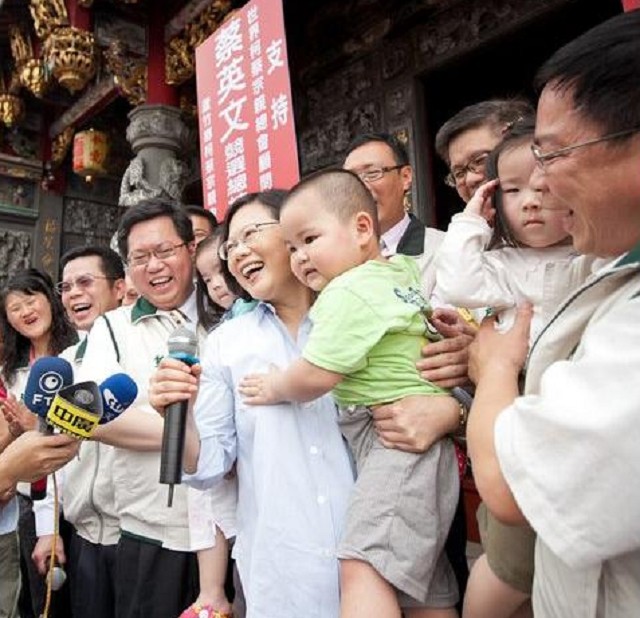 民進黨主席蔡英文1日下午到桃園五福宮上香,單手抱起胖小孩。圖片來源:臺灣媒體