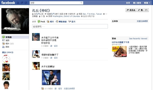 打開臉書發(fā)現(xiàn)最近不少人都有一個(gè)共同好友,那就是“孔丘”,此人名寫孔丘,字仲尼,自稱在孔門上班,現(xiàn)居臺(tái)灣宜蘭,家鄉(xiāng)是華盛頓,只是大頭貼看起來眼熟,是周潤發(fā)飾演的電影《孔子》劇照。