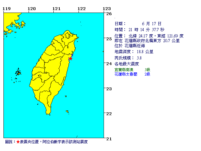 中國(guó)臺(tái)灣網(wǎng)6月17日消息 據(jù)臺(tái)灣氣象部門官網(wǎng)報(bào)道,17日21時(shí)14分,臺(tái)灣花蓮縣政府北偏東方20.7公里處發(fā)生里氏3.8級(jí)地震,地震深度為18.8公里。