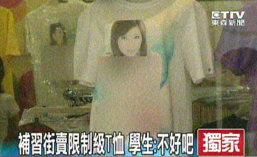 臺北補(bǔ)習(xí)街有服飾店公然販賣印有AV女優(yōu)圖像的T恤。圖片翻攝東森新聞