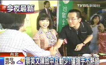 中國(guó)臺(tái)灣網(wǎng)7月24日消息 據(jù)臺(tái)灣TVBS電視臺(tái)報(bào)道,民進(jìn)黨主席蔡英文昨(23日)晚參加“臺(tái)灣北社”募款餐會(huì),與陳水扁之子陳致中同桌,但兩人互動(dòng)平淡,只短暫握手。席間,雙方各敬各的酒,蔡英文一直和游錫堃說話,陳致中則忙著跟妻子黃睿靚交談。就餐結(jié)束后,蔡英文上臺(tái)幫“北社”募款,但避談是否與陳水扁切割。(中國(guó)臺(tái)灣網(wǎng) 吳斌)