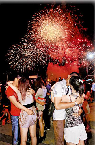 高雄市6日晚在茄萣情人碼頭舉辦“浪漫嗨趴”七夕活動,邀77對情人在璀璨的煙火映照下,擁吻77秒宣示愛情,受氣氛感染,臺下有些未報名的民眾也擁吻示愛,紀念七夕夜。圖片來源:臺灣媒體