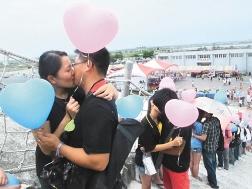 臺灣七股鹽雕藝術(shù)季在七夕情人節(jié)展開,活動邀請50對夫妻、情侶登鹽山舌吻,現(xiàn)場充滿甜蜜氣息。圖片來源:臺灣《聯(lián)合報》