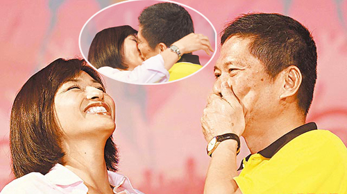 新婚3個多月的高雄市副市長李永得(右)與愛妻、民進黨民代邱議瑩,6日晚高調(diào)曬恩愛,兩人在高雄七夕情人節(jié)活動中,加入77對情人擁吻77秒行列,還示范標準動作(小圖)。圖片來源:臺灣媒體