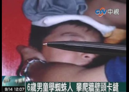 5歲男童為模仿“蜘蛛俠” 身體卻還卡在墻縫外動(dòng)彈不得。圖片來(lái)源:臺(tái)灣“今日新聞網(wǎng)”
