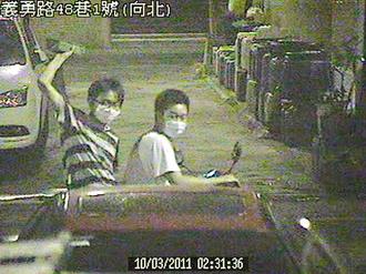 監(jiān)視器拍下砸車過程,圖中兩名少年拿磚頭正準(zhǔn)備砸車。(圖片來源:臺(tái)灣《聯(lián)合報(bào)》)