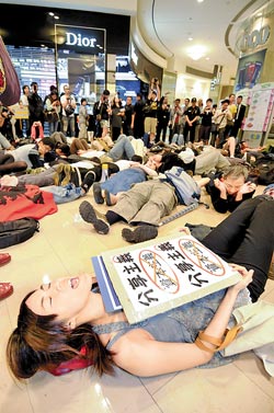 呼應(yīng)“占領(lǐng)華爾街”運(yùn)動(dòng)的臺(tái)灣地區(qū)民眾,發(fā)動(dòng)包圍臺(tái)北地標(biāo)101大樓。(圖片來(lái)源:臺(tái)灣《中國(guó)時(shí)報(bào)》)