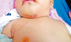 僅僅1個半月大的小男嬰,全身是傷。(圖片來源于:臺灣《中國時報》)
