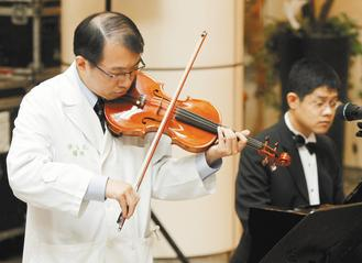 中國臺灣網(wǎng)11月9日消息 據(jù)臺灣《聯(lián)合報》報道,臺大醫(yī)院昨天舉辦醫(yī)師節(jié)感恩音樂會,擔(dān)綱的主角一位是執(zhí)行換腎手術(shù)的臺大外科醫(yī)師蔡孟昆,一位是換腎的音樂家莊天岳,醫(yī)病兩人合奏“愛的禮贊”,贏得滿堂采;蔡孟昆說,他已走出誤植艾滋器官事件的低潮期,靠的就是拉小提琴減輕壓力。