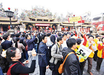 陸客倍增,擠滿臺(tái)灣朝天宮廣場(chǎng),帶動(dòng)臺(tái)灣華語(yǔ)導(dǎo)游需求,臺(tái)灣民眾報(bào)考導(dǎo)游證考試的考生也大幅增長(zhǎng)。(圖片來(lái)源于:臺(tái)灣《聯(lián)合報(bào)》)