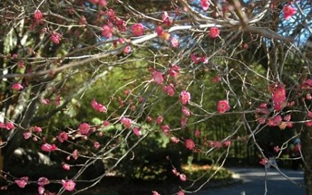 中國臺灣網12月21日消息 據臺灣《聯合報》報道,臺灣楓葉剛紅,冬至還沒到,可臺中武陵農場的紅梅花竟然開了,武陵路旁10余株梅樹均見紅花悄悄上枝頭,提早揭開賞梅季。