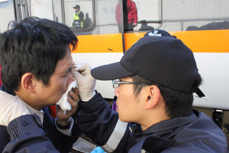 出事的太魯閣號列車的列車長(左)的頭部受傷,堅持留在現(xiàn)場未就醫(yī),桃園縣政府消防局救護(hù)員現(xiàn)場為他上藥。(圖片來自臺灣媒體)