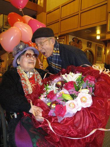 嘉義市90歲老翁蔡戊田(右)、與87歲的妻子黃華月(左)結(jié)婚64年,于13日情人節(jié)前夕再度約會(huì),蔡戊田出其不意,獻(xiàn)上超大的情人花束,讓黃華月感動(dòng)又開心。 圖片來(lái)源:臺(tái)灣“中央社”