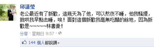 罹患卵巢癌、正在化療的的民進(jìn)黨籍“立委”邱議瑩,12日在臉書PO文說(shuō),“老公最近有新歡,為了他可以熬夜晚睡,怕我騷擾,就哄我去睡。面對(duì)這個(gè)新歡,我毫無(wú)吃醋的余地,因?yàn)閷?duì)象是林書豪”。有網(wǎng)友回應(yīng),NBA寡婦又一位;有網(wǎng)友安慰她要看開一點(diǎn)。